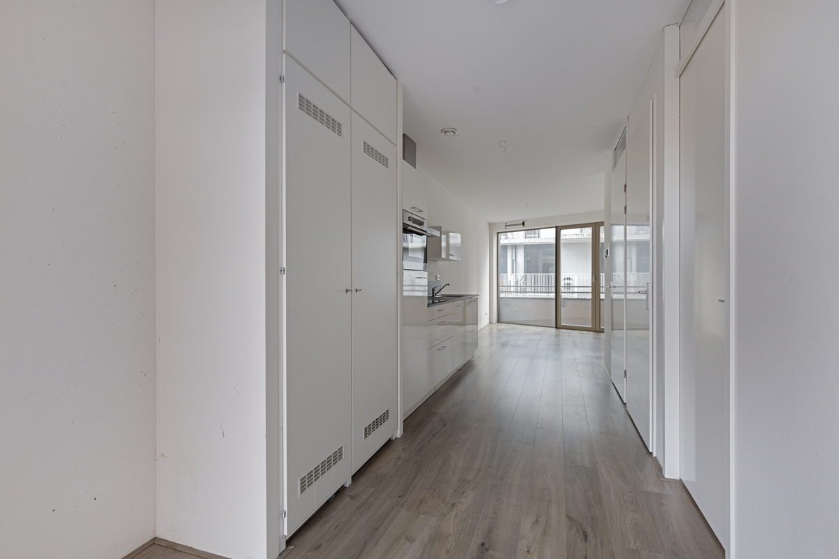 All rooms of the house can be reached from the entrance. On the right side is teh bedroom, approximately 9 m2. The luxuriously finished bathroom and storage room with washing machine connection can also be reached from the hall. At the rear of the apartment is the living room of approximately 15 m2 with on the left side an open kitchen with all necessary appliances. Such as a combi oven / microwave, hob, extractor, fridge / freezer and a dishwasher. The balcony is accessible from the living room and has an area of approximately 7 m2.