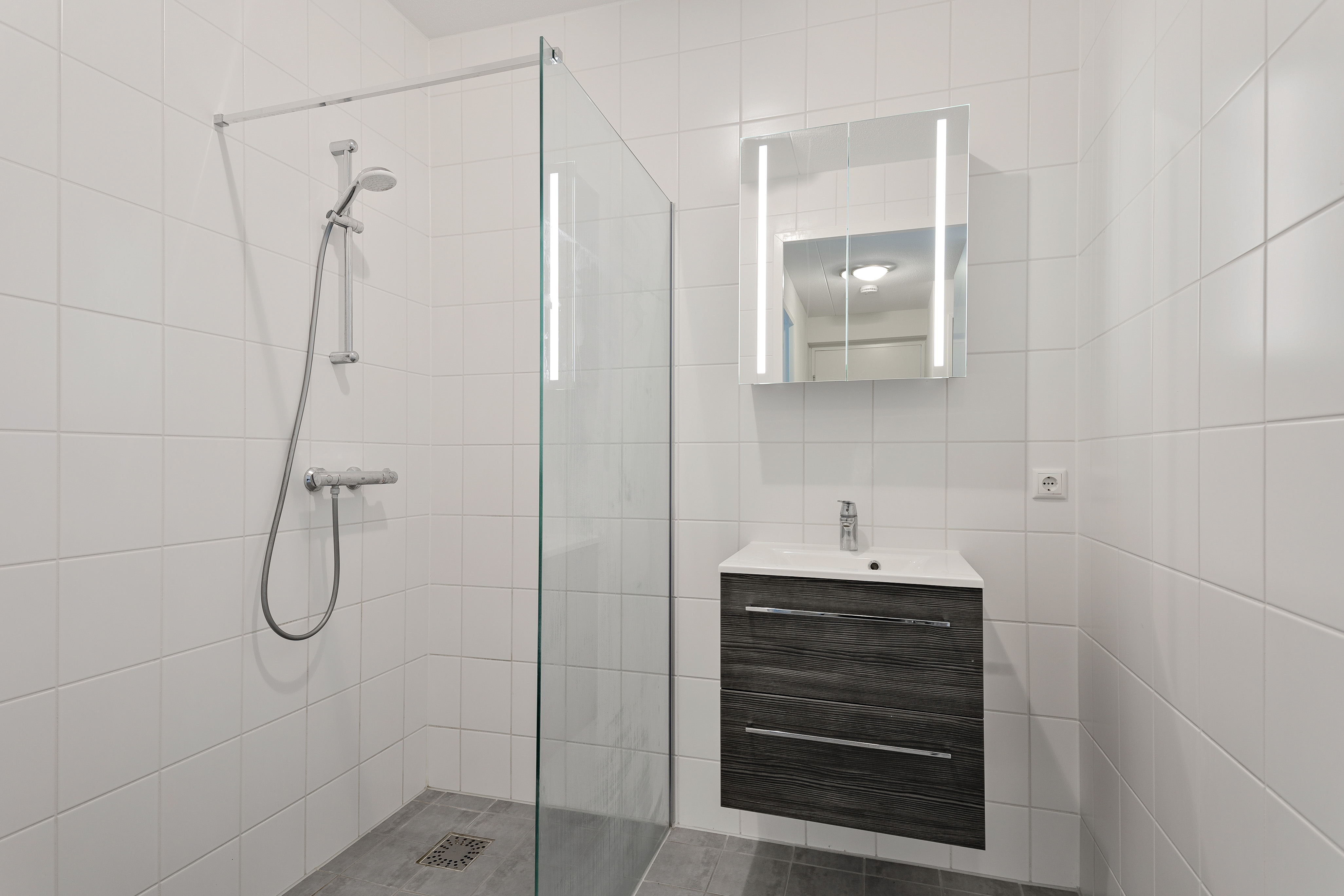 All rooms of the apartment can be reached from the hall. At the entrance you will find the separate toilet on the right and the storage room with washing machine / dryer connection and modern bathroom with walk-in shower and sink with washbasin on the left. The bedrooms have an area of both approximately 10 m2. The living room with modern kitchen is located on the other side of the apartment and has an area of approximately 35 m2. Easy to arrange for a living and dining area. The kitchen is equipped with all necessary appliances such as a refrigerator, freezer, hob, dishwasher, combi oven/microwave, dishwasher and extractor hood. The terrace of approximately 6 m2 can be reached from the second bedroom and living room.